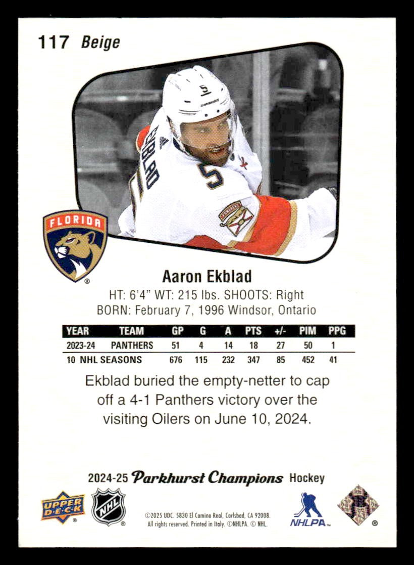 This is a sharp example of the 2024-25 Parkhurst Champions #117 featuring Aaron Ekblad.