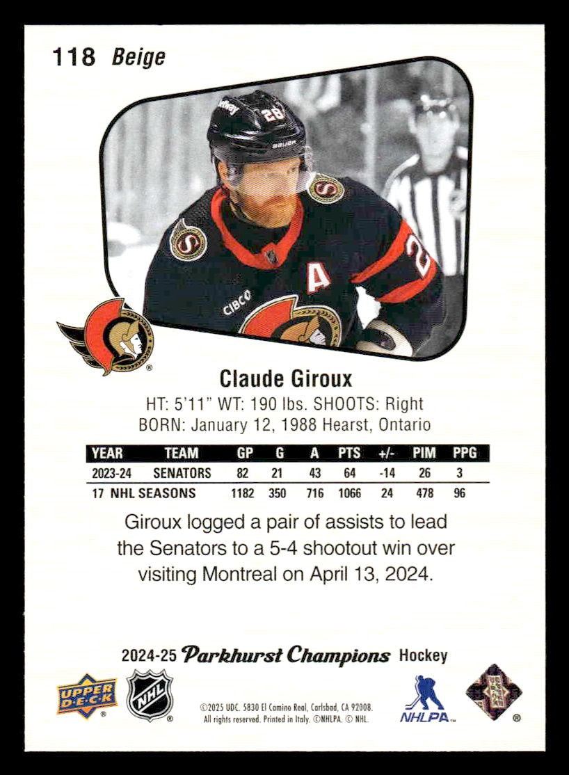 Claude Giroux played for the Ottawa Senators in 2024, and this card is a standout from the Upper Deck 2024-25 Parkhurst Champions release. Whether you're chasing rookies, SSPs, or building a premium collection, this card delivers.