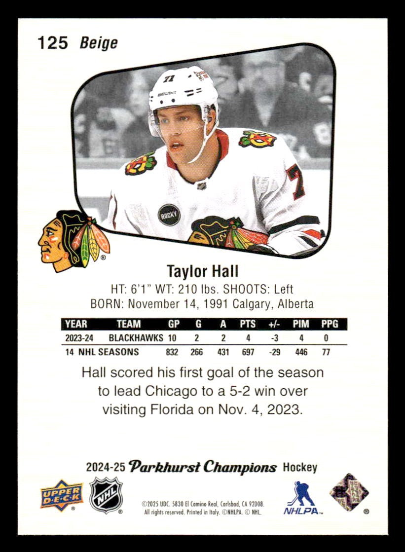 Taylor Hall played for the Chicago Blackhawks in 2024, and this card is a standout from the Upper Deck 2024-25 Parkhurst Champions release. Whether you're chasing rookies, SSPs, or building a premium collection, this card delivers.
