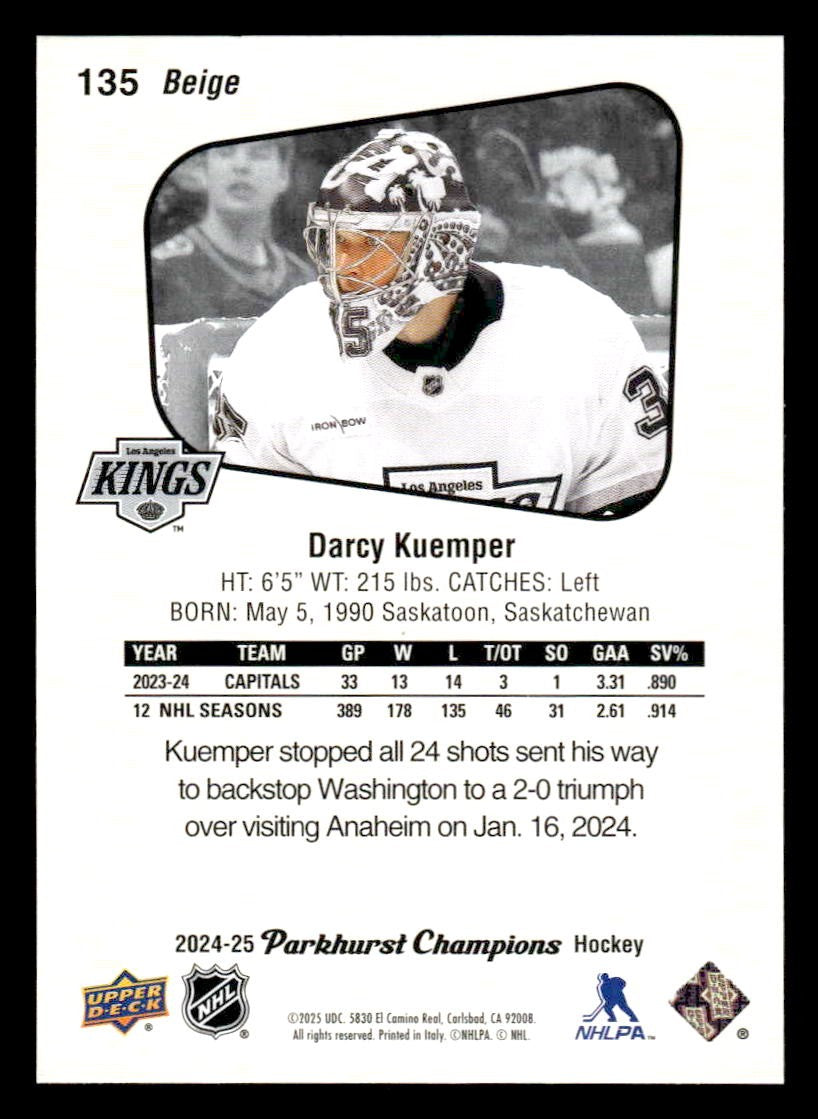 This is a sharp example of the 2024-25 Parkhurst Champions #135 featuring Darcy Kuemper.
