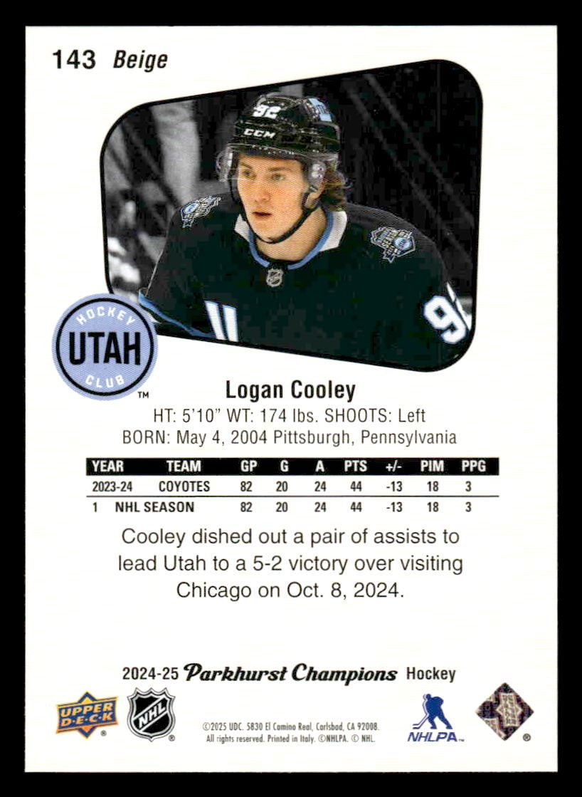 This is a sharp example of the 2024-25 Parkhurst Champions #143 featuring Logan Cooley.