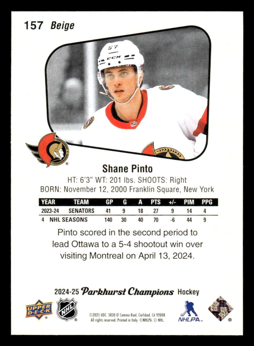 Shane Pinto played for the Ottawa Senators in 2024, and this card is a standout from the Upper Deck 2024-25 Parkhurst Champions release. Whether you're chasing rookies, SSPs, or building a premium collection, this card delivers.