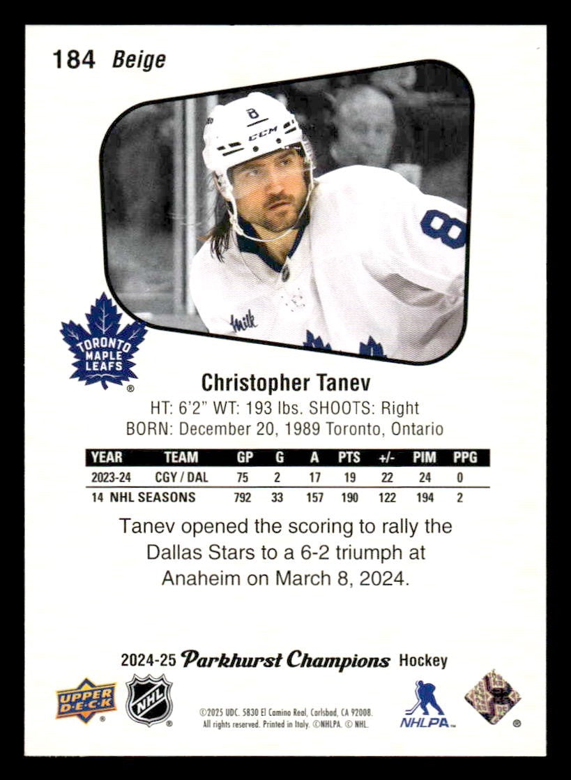 Christopher Tanev played for the Toronto Maple Leafs in 2024, and this card is a standout from the Upper Deck 2024-25 Parkhurst Champions release. Whether you're chasing rookies, SSPs, or building a premium collection, this card delivers.