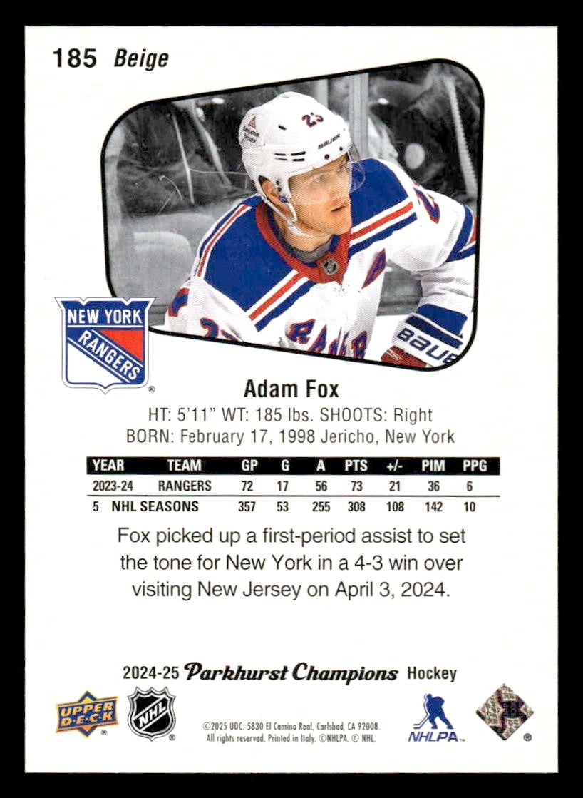 Adam Fox played for the New York Rangers in 2024, and this card is a standout from the Upper Deck 2024-25 Parkhurst Champions release. Whether you're chasing rookies, SSPs, or building a premium collection, this card delivers.