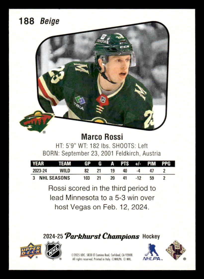 Marco Rossi played for the Minnesota Wild in 2024, and this card is a standout from the Upper Deck 2024-25 Parkhurst Champions release. Whether you're chasing rookies, SSPs, or building a premium collection, this card delivers.