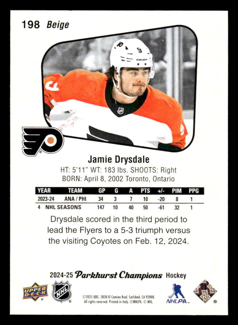 Jamie Drysdale played for the Philadelphia Flyers in 2024, and this card is a standout from the Upper Deck 2024-25 Parkhurst Champions release. Whether you're chasing rookies, SSPs, or building a premium collection, this card delivers.