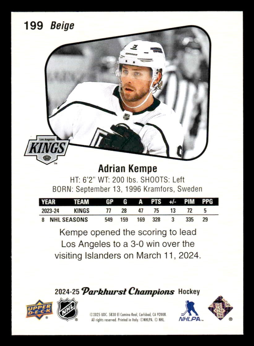This is a sharp example of the 2024-25 Parkhurst Champions #199 featuring Adrian Kempe.