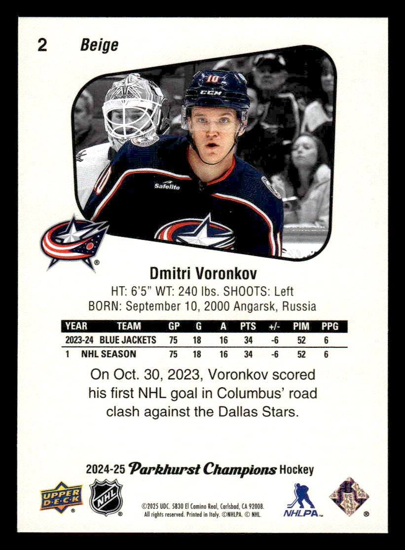 Dmitri Voronkov played for the Columbus Blue Jackets in 2024, and this card is a standout from the Upper Deck 2024-25 Parkhurst Champions release. Whether you're chasing rookies, SSPs, or building a premium collection, this card delivers.