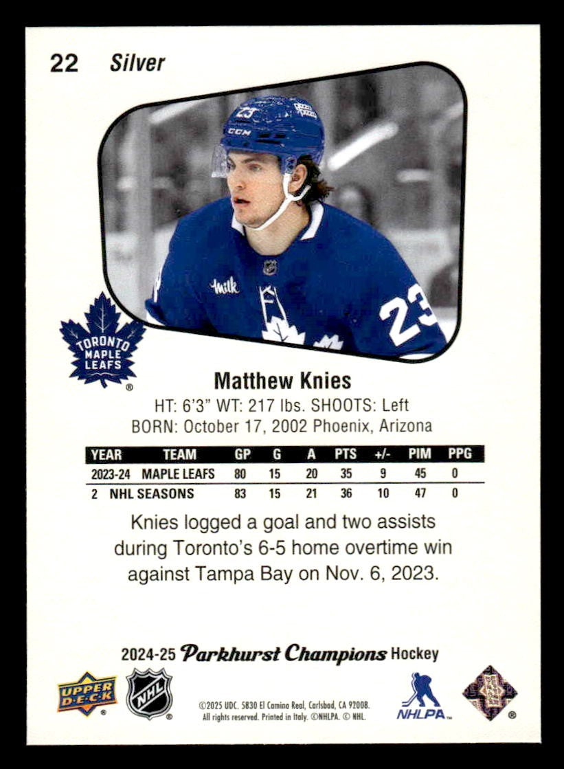 Matthew Knies played for the Toronto Maple Leafs in 2024, and this card is a standout from the Upper Deck 2024-25 Parkhurst Champions release. Whether you're chasing rookies, SSPs, or building a premium collection, this card delivers.