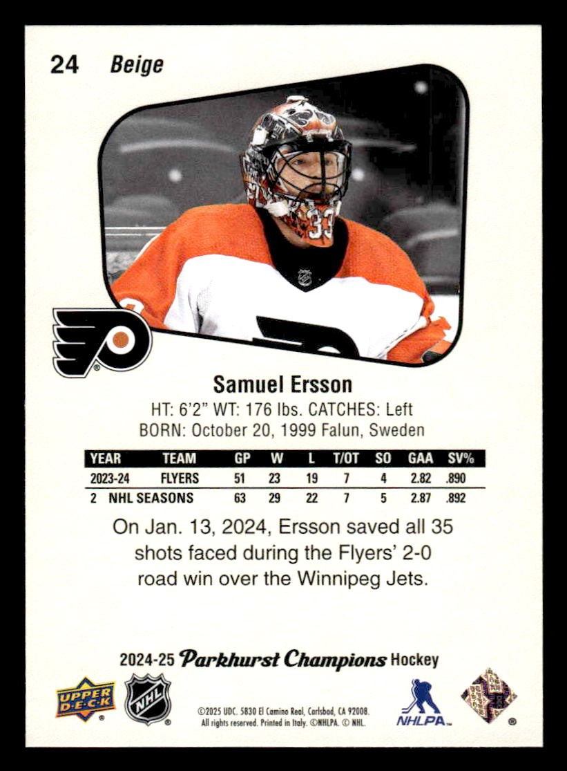 This is a sharp example of the 2024-25 Parkhurst Champions #24 featuring Samuel Ersson.