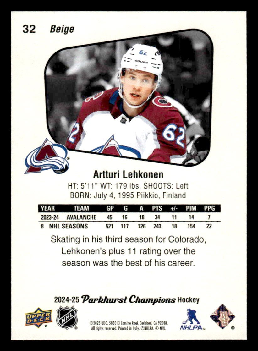 Artturi Lehkonen played for the Colorado Avalanche in 2024, and this card is a standout from the Upper Deck 2024-25 Parkhurst Champions release. Whether you're chasing rookies, SSPs, or building a premium collection, this card delivers.