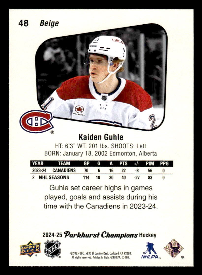 This is a sharp example of the 2024-25 Parkhurst Champions #48 featuring Kaiden Guhle.
