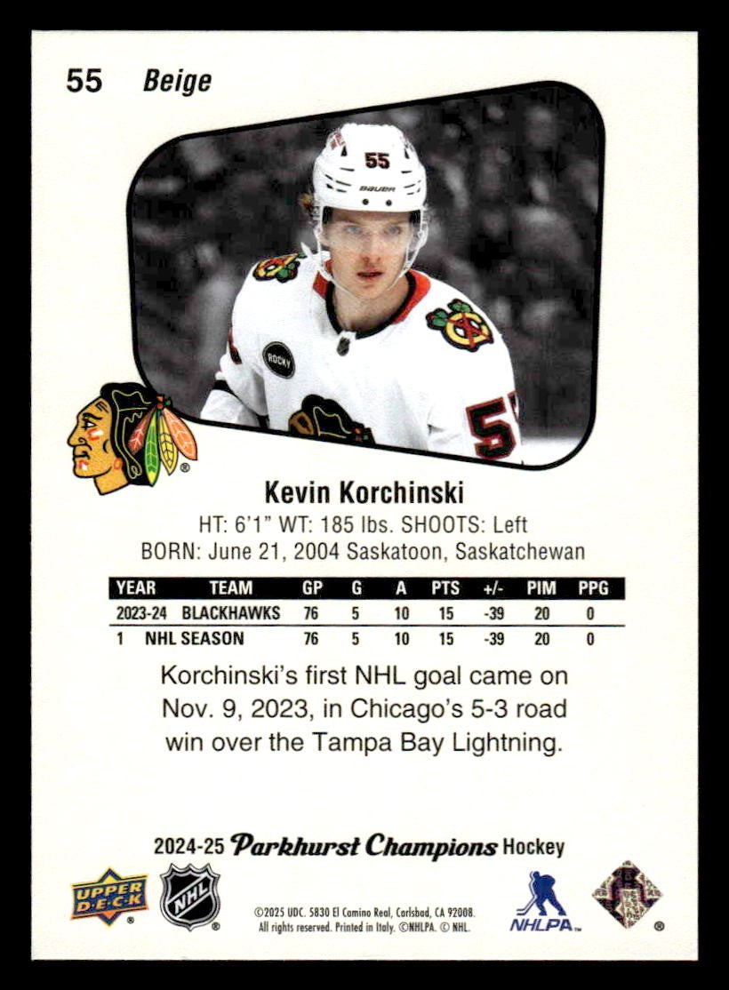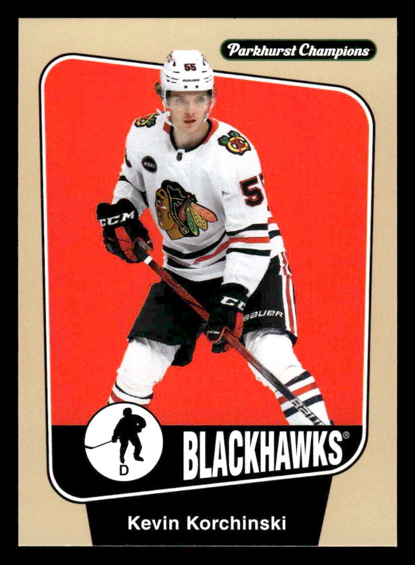 This is a sharp example of the 2024-25 Parkhurst Champions #55 featuring Kevin Korchinski.