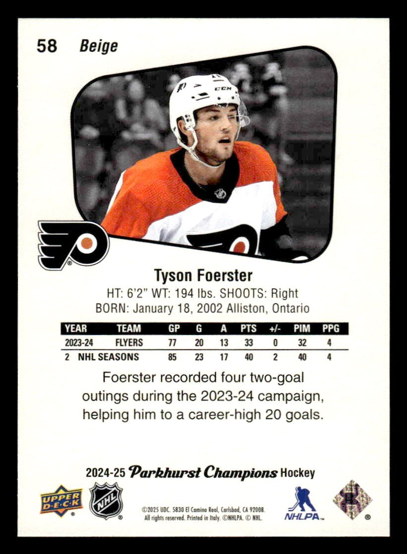 This is a sharp example of the 2024-25 Parkhurst Champions #58 featuring Tyson Foerster.