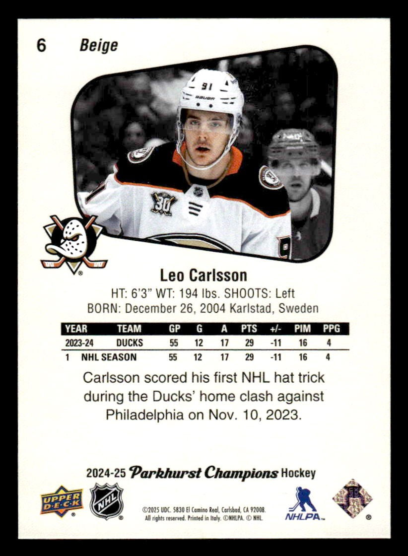This is a sharp example of the 2024-25 Parkhurst Champions #6 featuring Leo Carlsson.