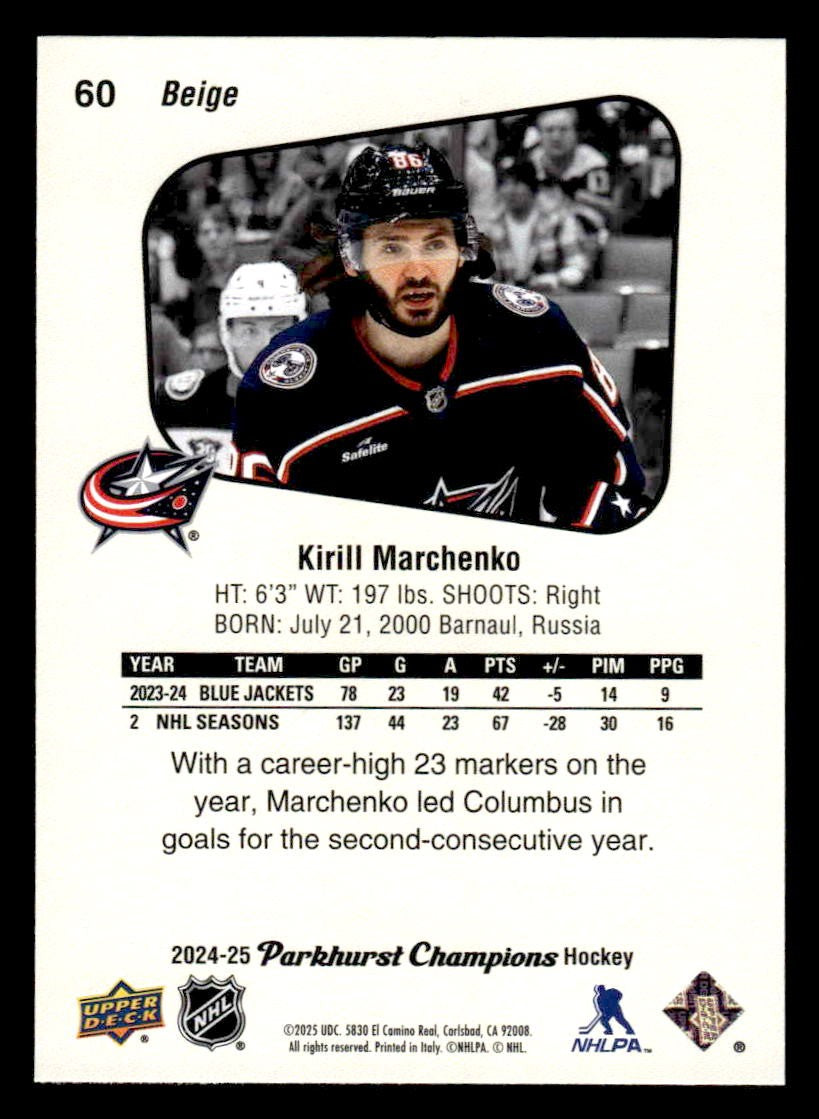 Kirill Marchenko played for the Columbus Blue Jackets in 2024, and this card is a standout from the Upper Deck 2024-25 Parkhurst Champions release. Whether you're chasing rookies, SSPs, or building a premium collection, this card delivers.