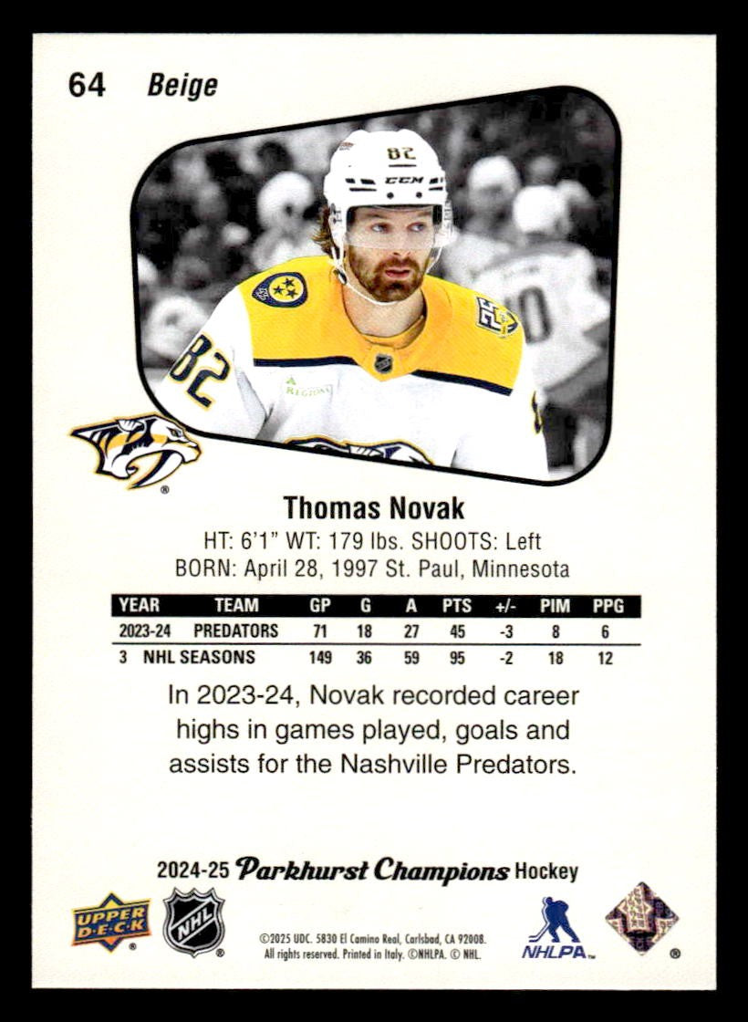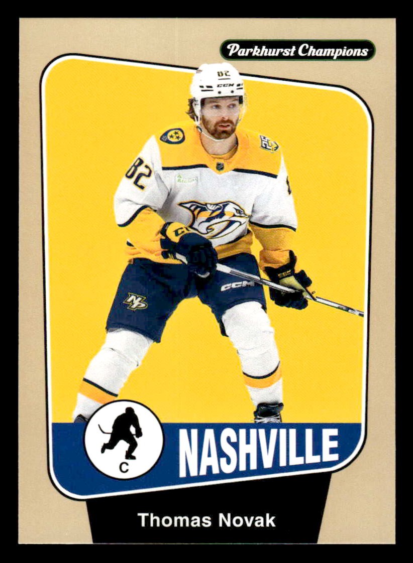 Thomas Novak played for the Nashville Predators in 2024, and this card is a standout from the Upper Deck 2024-25 Parkhurst Champions release. Whether you're chasing rookies, SSPs, or building a premium collection, this card delivers.