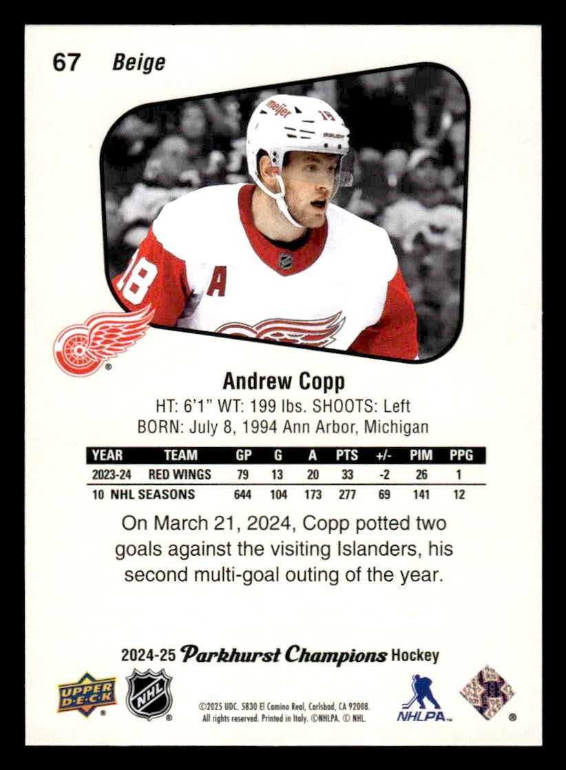 Andrew Copp played for the Detroit Red Wings in 2024, and this card is a standout from the Upper Deck 2024-25 Parkhurst Champions release. Whether you're chasing rookies, SSPs, or building a premium collection, this card delivers.