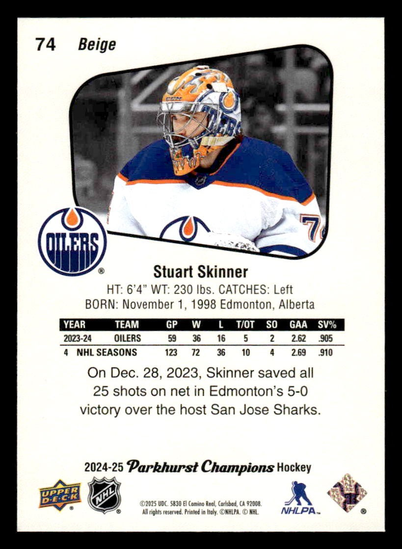 This is a sharp example of the 2024-25 Parkhurst Champions #74 featuring Stuart Skinner.
