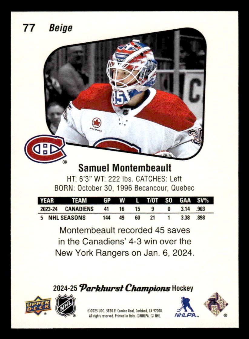 This is a sharp example of the 2024-25 Parkhurst Champions #77 featuring Samuel Montembeault.