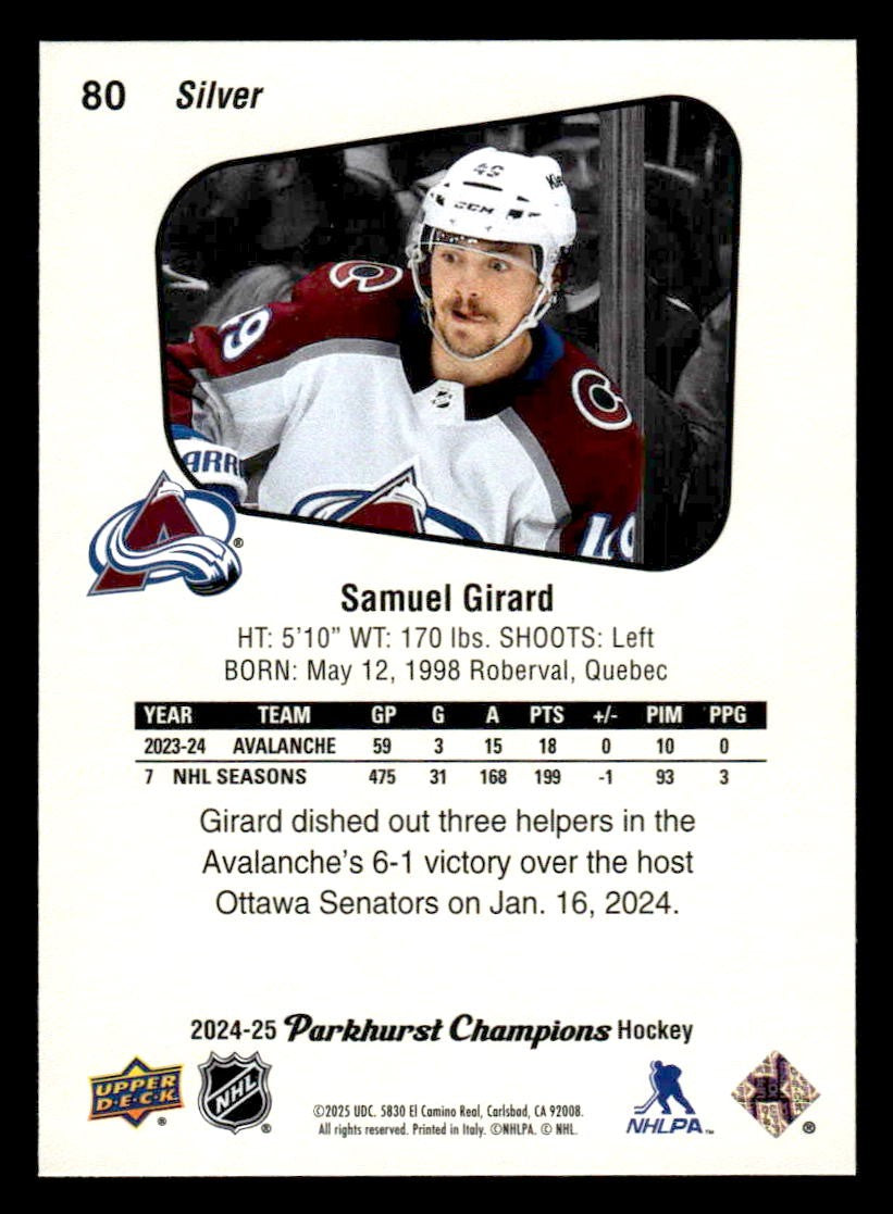 This is a sharp example of the 2024-25 Parkhurst Champions #80 featuring Samuel Girard.