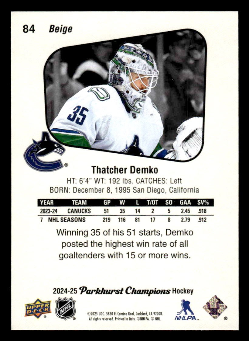 This is a sharp example of the 2024-25 Parkhurst Champions #84 featuring Thatcher Demko.