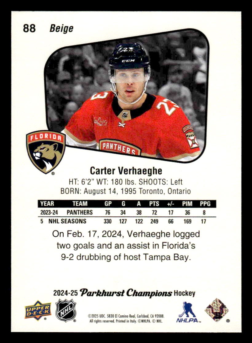 This is a sharp example of the 2024-25 Parkhurst Champions #88 featuring Carter Verhaeghe.