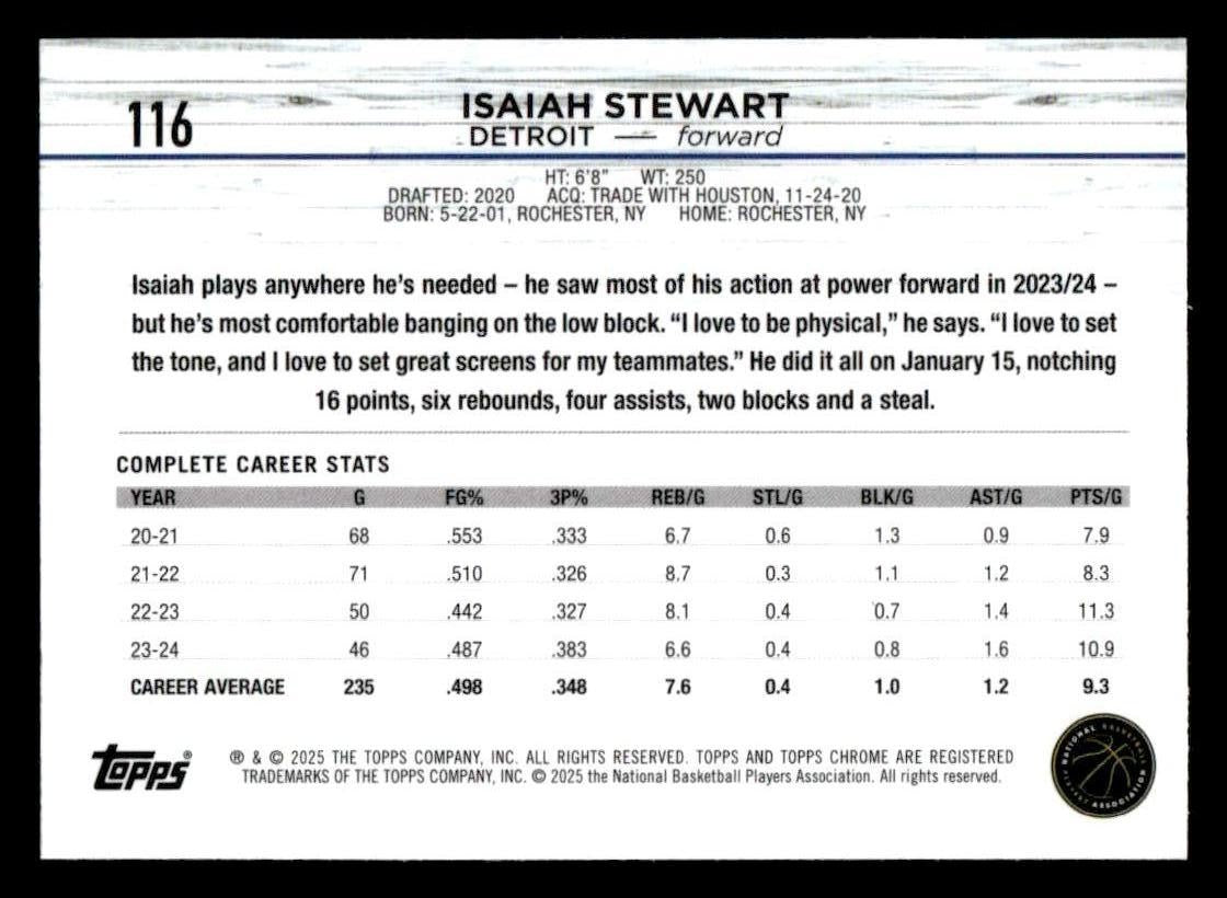 This is a sharp example of the 2024-25 Topps Chrome #116 featuring Isaiah Stewart.