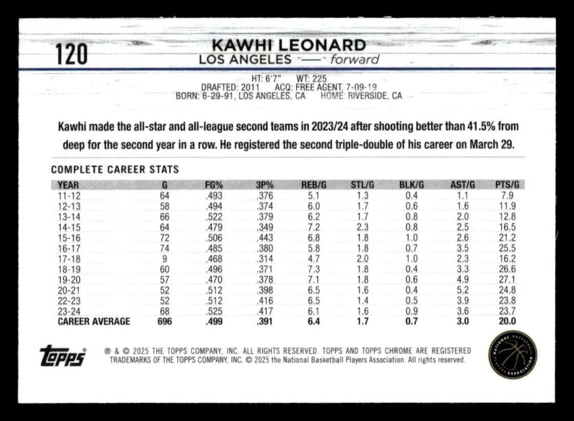 This is a sharp example of the 2024-25 Topps Chrome #120 featuring Kawhi Leonard.