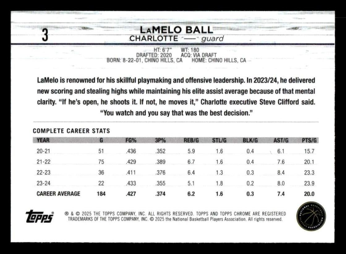This is a sharp example of the 2024-25 Topps Chrome #3 featuring LaMelo Ball.