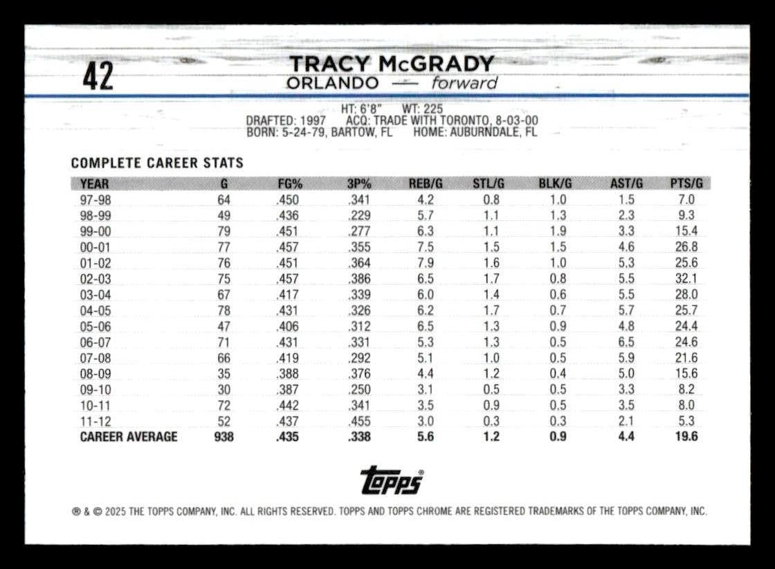 This is a sharp example of the 2024-25 Topps Chrome #42 featuring Tracy McGrady.