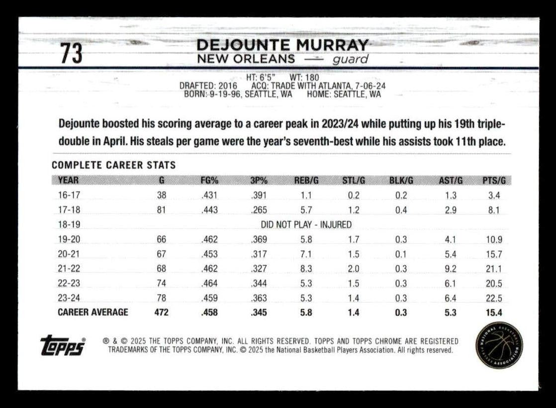 Dejounte Murray played for the New Orleans Pelicans in 2024, and this card is a standout from the Topps 2024-25 Topps Chrome release. Whether you're chasing rookies, SSPs, or building a premium collection, this card delivers.