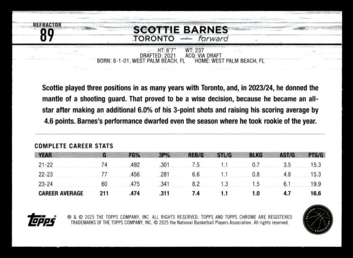 This is a sharp example of the 2024-25 Topps Chrome #89 featuring Scottie Barnes.