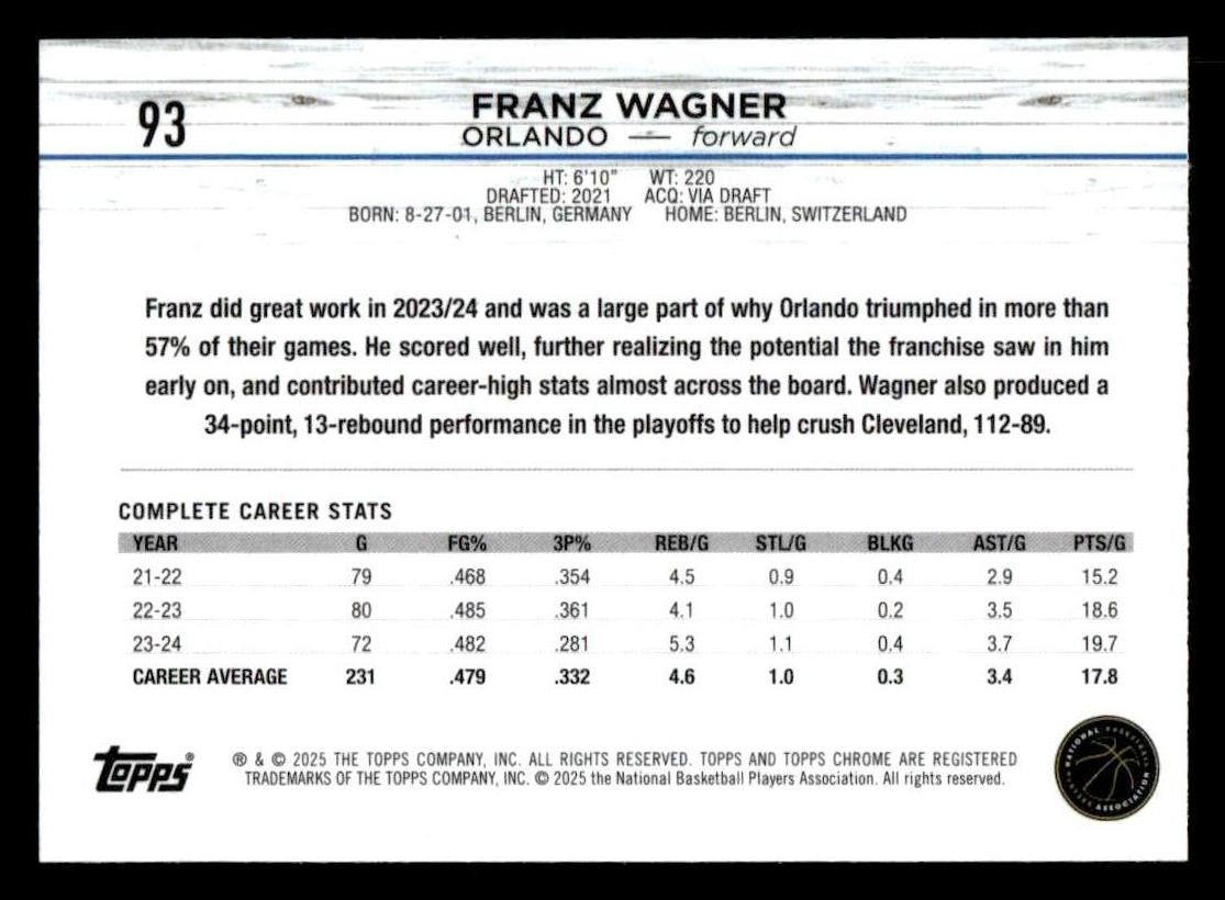 This is a sharp example of the 2024-25 Topps Chrome #93 featuring Franz Wagner.