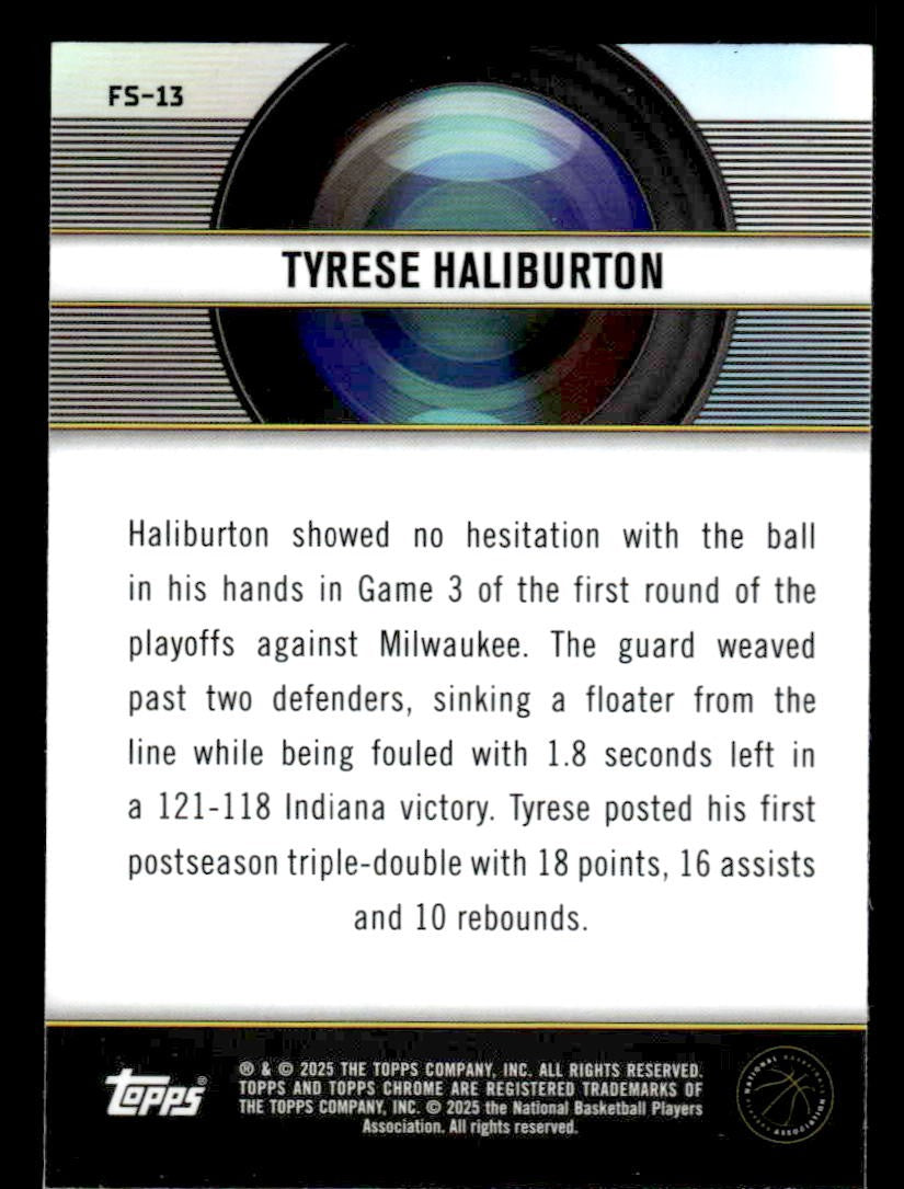 This is a sharp example of the 2024-25 Topps Chrome #FS-13 featuring Tyrese Haliburton.