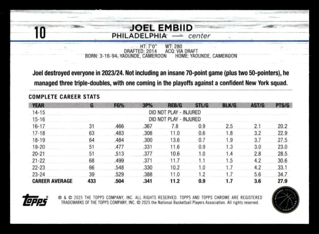 Joel Embiid β 2024 Topps 2024-25 Topps Chrome Sapphire
