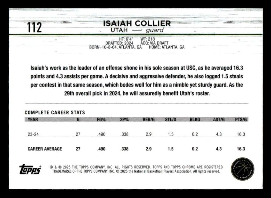 This is a sharp example of the 2024-25 Topps Chrome Sapphire #112 featuring Isaiah Collier.