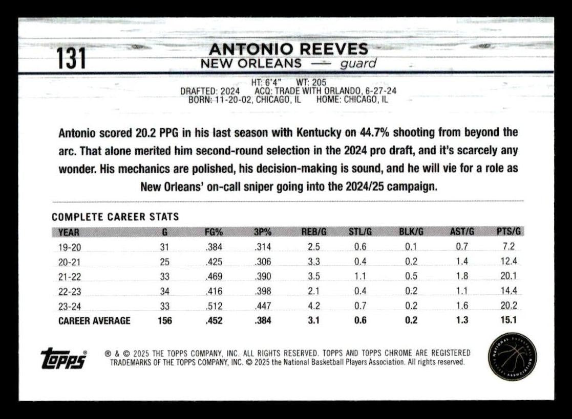 Antonio Reeves played for the New Orleans Pelicans in 2024, and this card is a standout from the Topps 2024-25 Topps Chrome Sapphire release. Whether you're chasing rookies, SSPs, or building a premium collection, this card delivers.