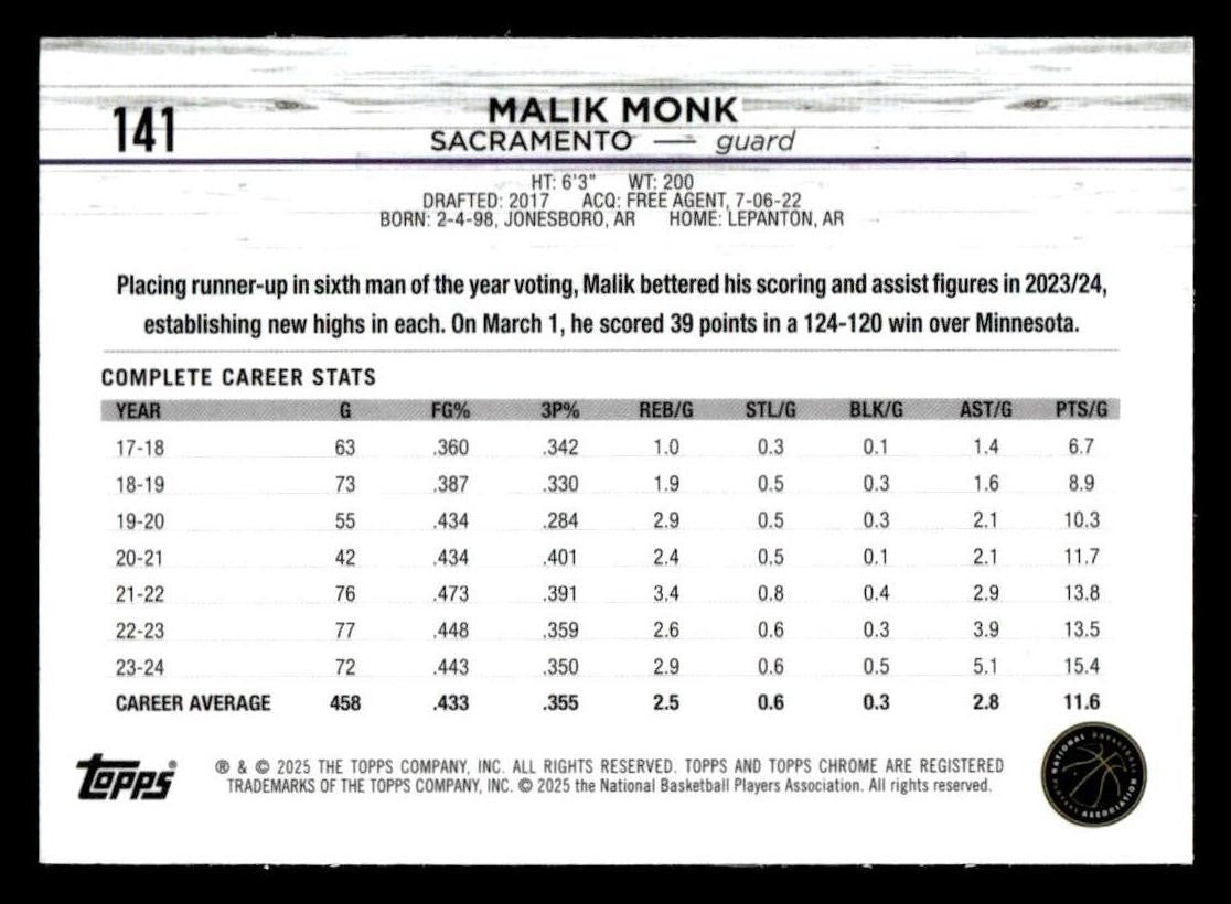 This is a sharp example of the 2024-25 Topps Chrome Sapphire #141 featuring Malik Monk.