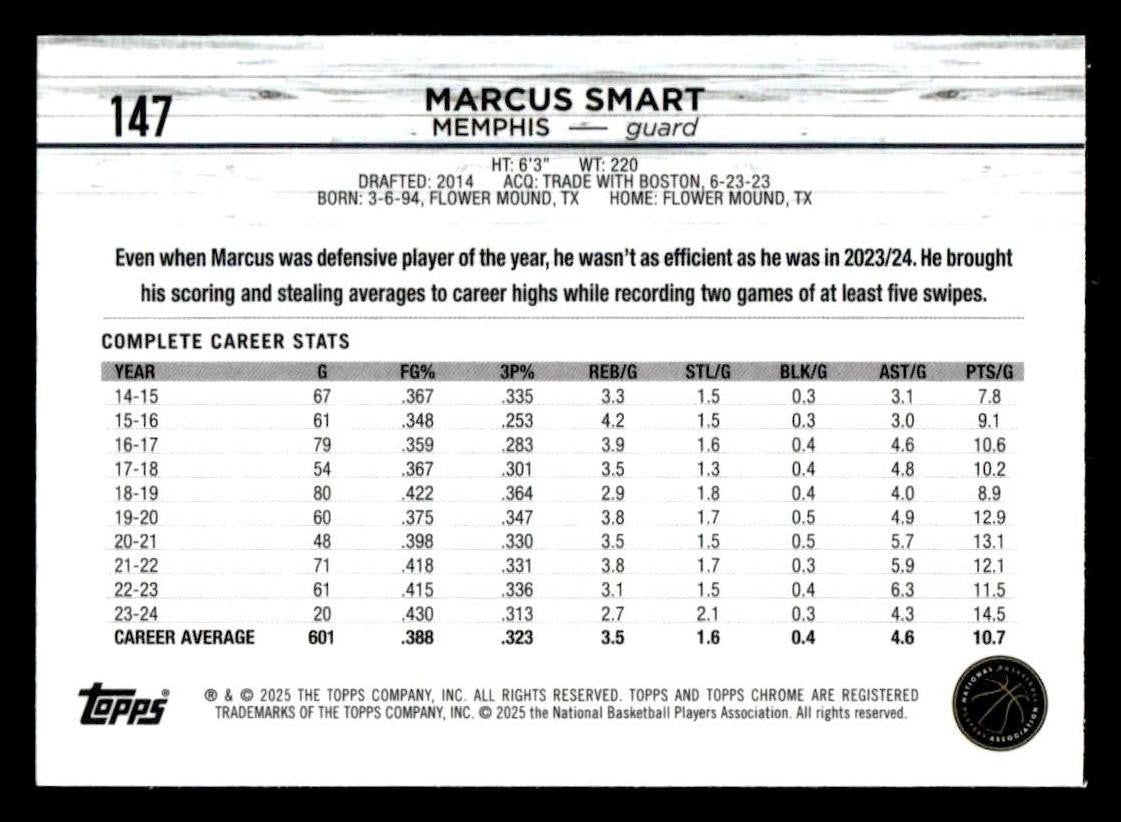 Marcus Smart played for the Memphis Grizzlies in 2024, and this card is a standout from the Topps 2024-25 Topps Chrome Sapphire release. Whether you're chasing rookies, SSPs, or building a premium collection, this card delivers.