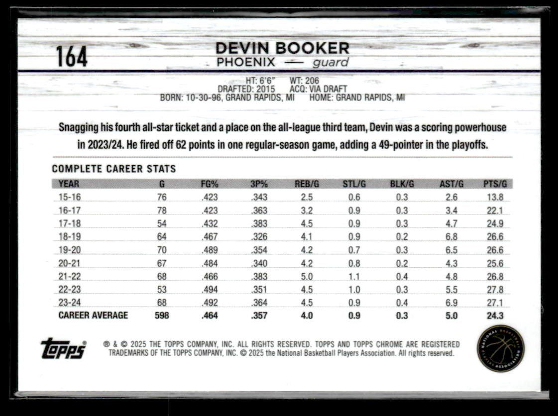 This is a sharp example of the 2024-25 Topps Chrome Sapphire #164 featuring Devin Booker.