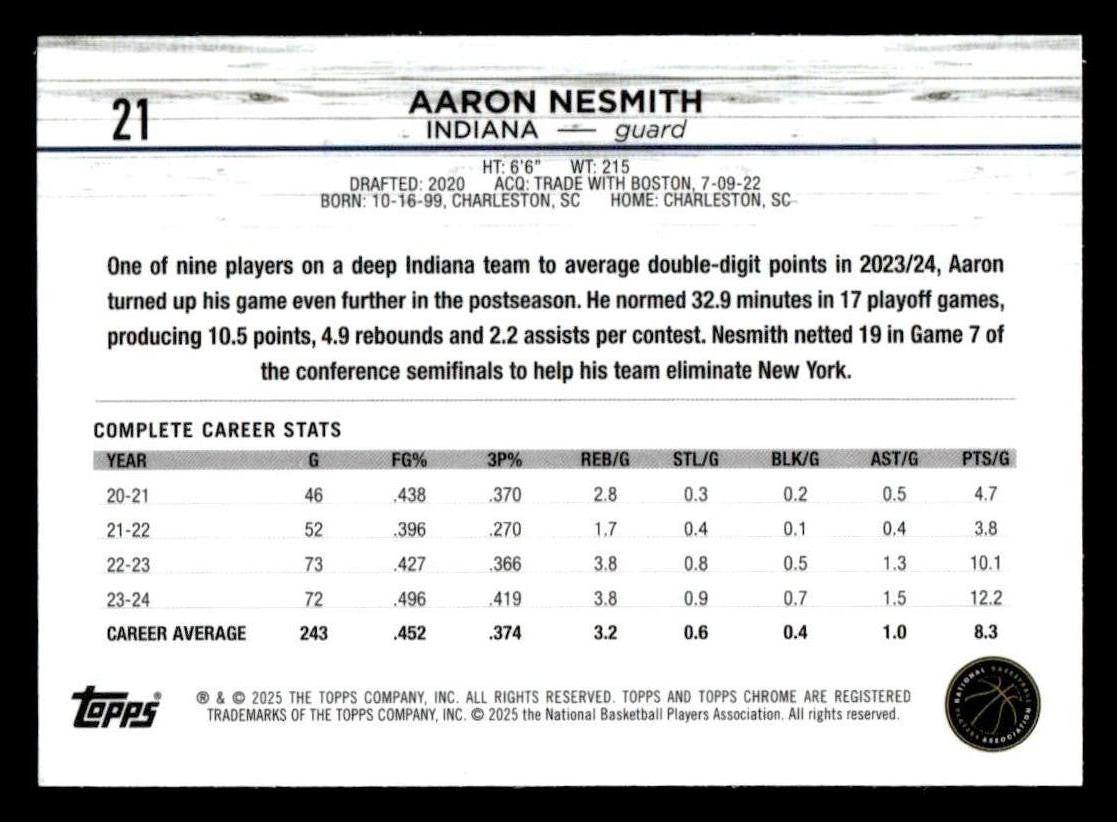 This is a sharp example of the 2024-25 Topps Chrome Sapphire #21 featuring Aaron Nesmith.