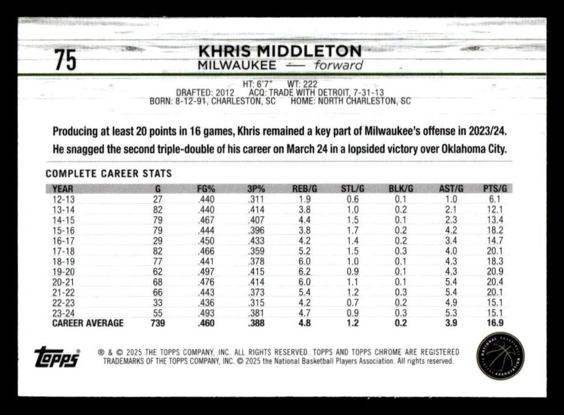Khris Middleton played for the Milwaukee Bucks in 2024, and this card is a standout from the Topps 2024-25 Topps Chrome Sapphire release. Whether you're chasing rookies, SSPs, or building a premium collection, this card delivers.