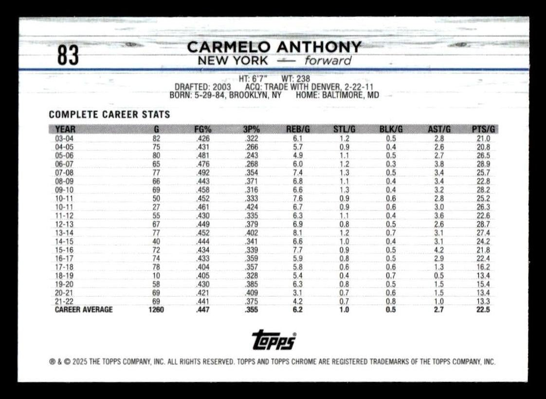 2024-25 Topps Chrome Sapphire #83 Carmelo Anthony