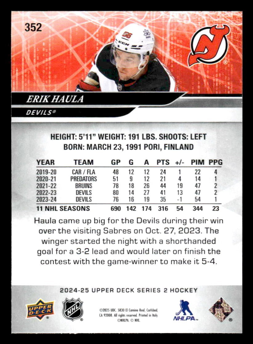 This is a nice example of a 2024-25 Upper Deck #352 Erik Haula