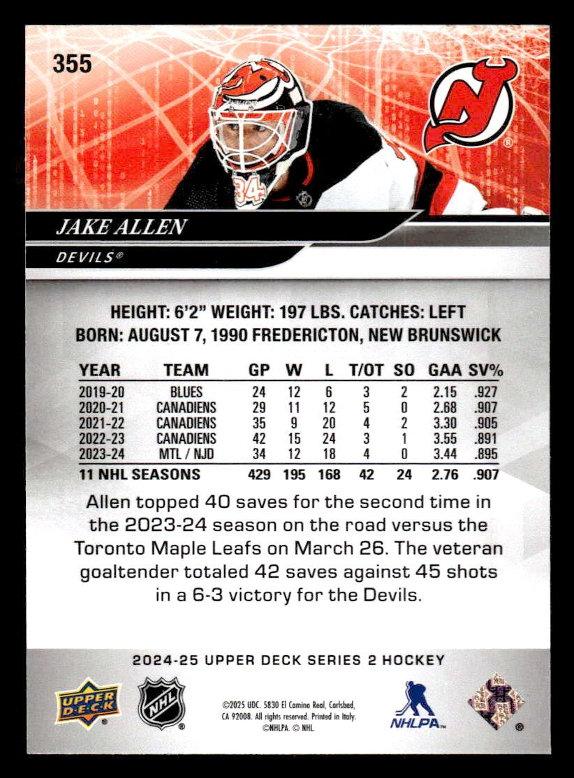 This is a nice example of a 2024-25 Upper Deck #355 Jake Allen