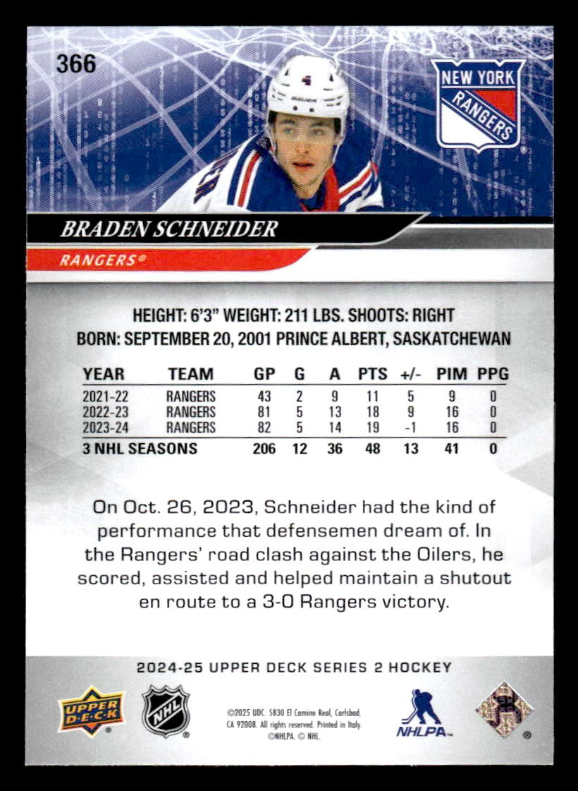 This is a nice example of a 2024-25 Upper Deck #366 Braden Schneider