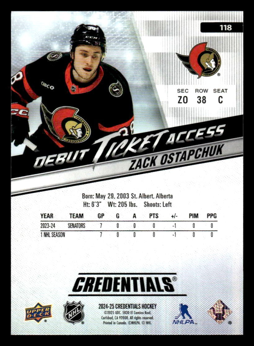 This is a sharp example of the 2024-25 Upper Deck Credentials #118 featuring Zack Ostapchuk.