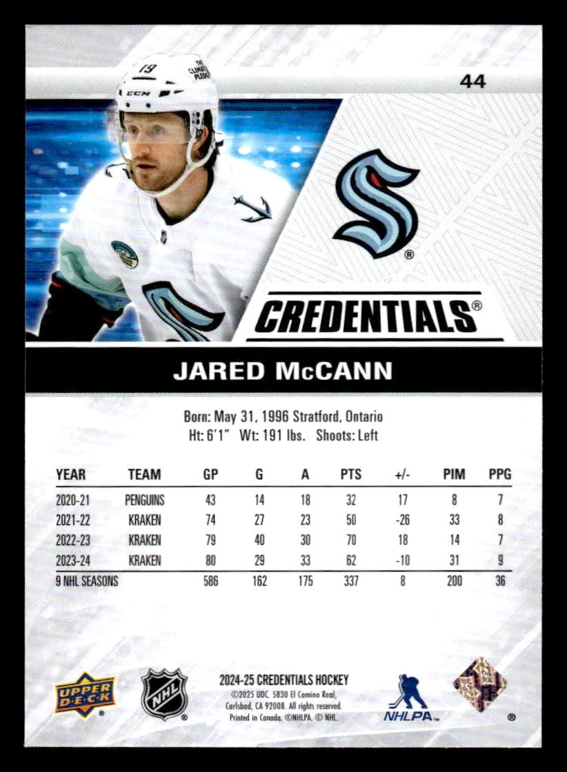 Jared McCann played for the Seattle Kracken in 2024, and this card is a standout from the Upper Deck 2024-25 Upper Deck Credentials release. Whether you're chasing rookies, SSPs, or building a premium collection, this card delivers.