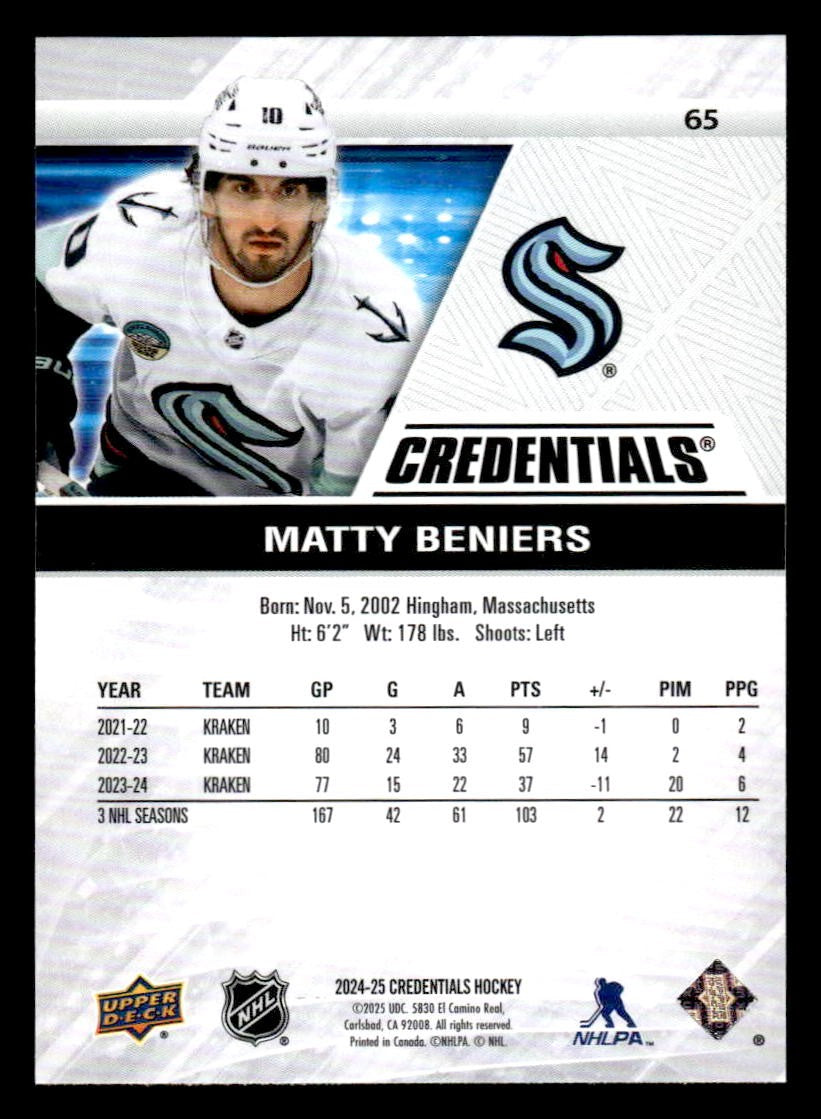 This is a sharp example of the 2024-25 Upper Deck Credentials #65 featuring Matty Beniers.